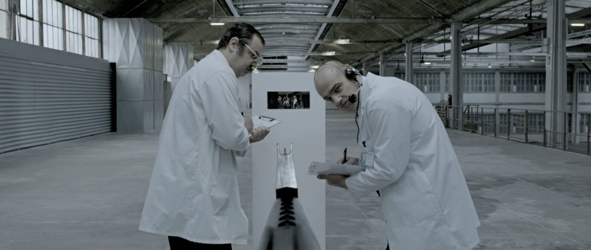 As the dance beat drops we get to see people being human for a moment, dancing freely. Till it is revealed these free dancing humans are in a box, being monitored/studied by lab coat science guys. Then, seemingly surprisingly to the lab coat science guys, machine gun weapons float in to interrupt the free dancing humans. This seems to represent the weapons themselves taking initiative to disrupt humanity.