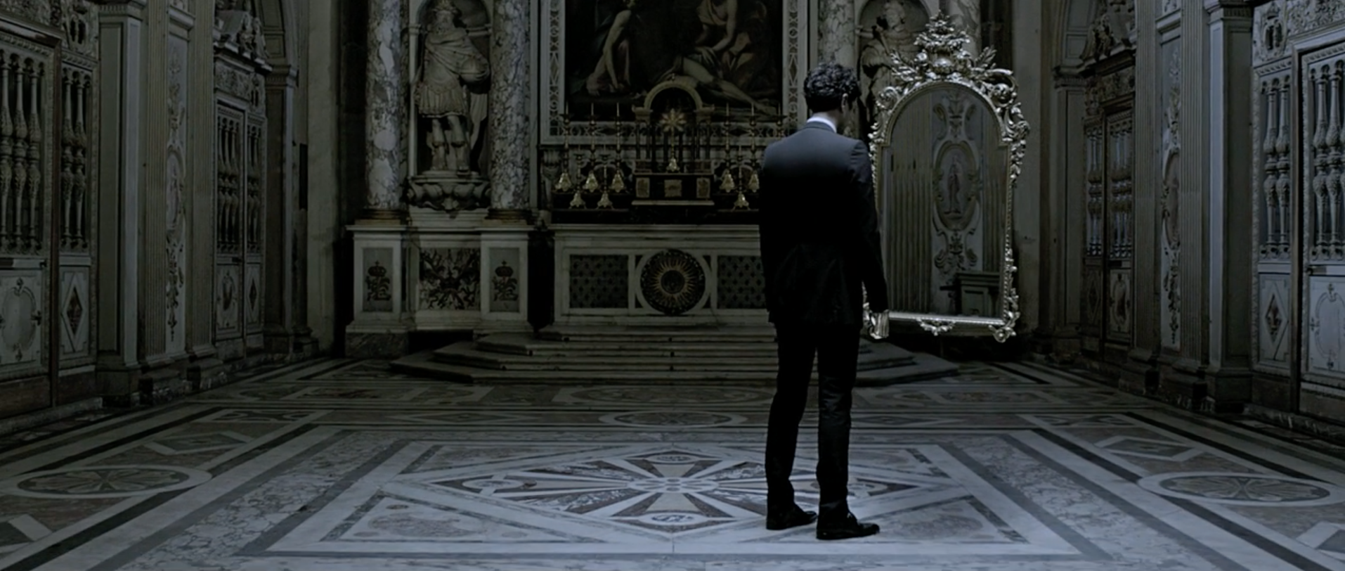 Two: It could also be viewed this vampire part of society is lacking self awareness because they can't see themselves. Not only is there no mirror reflection but Gesaffelstein's character is all alone. There's no family, friends, nor strangers to reflect back providing self awareness. Without proper self reflection, its difficult to progress.