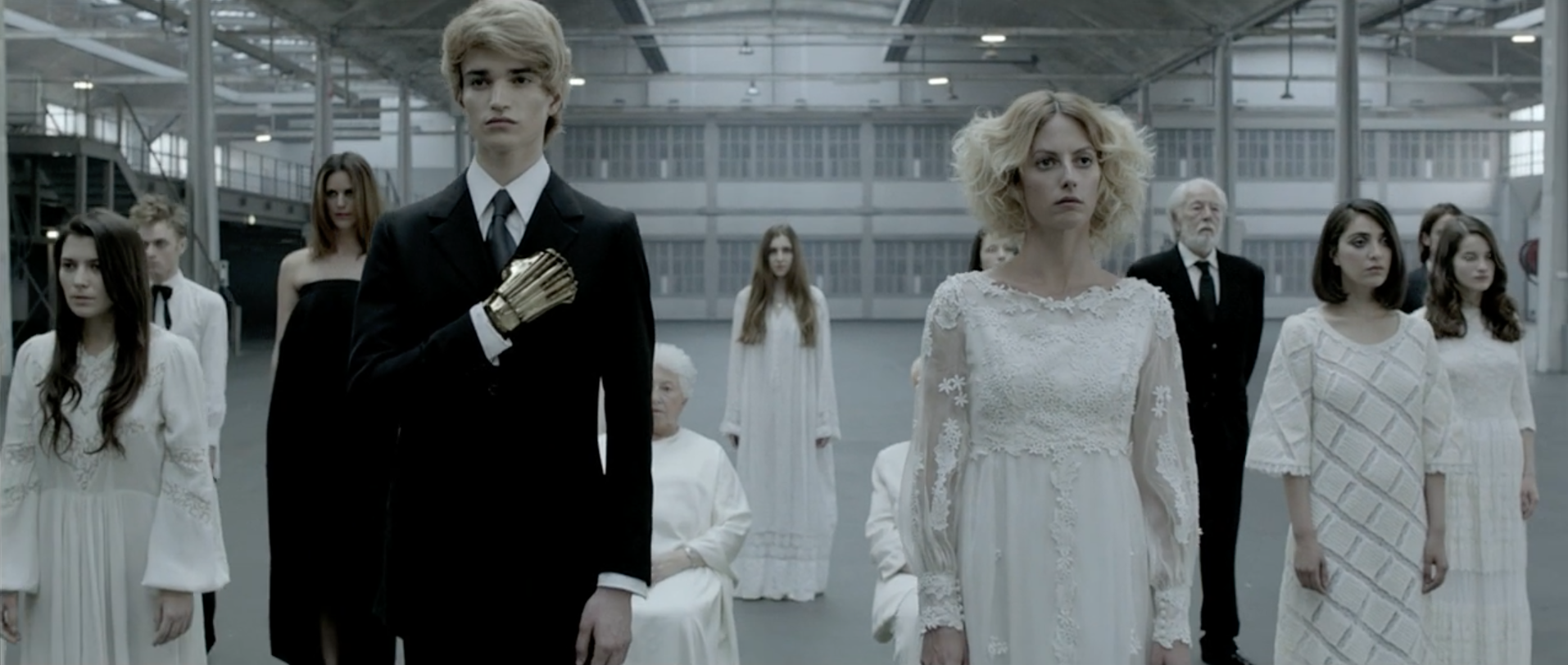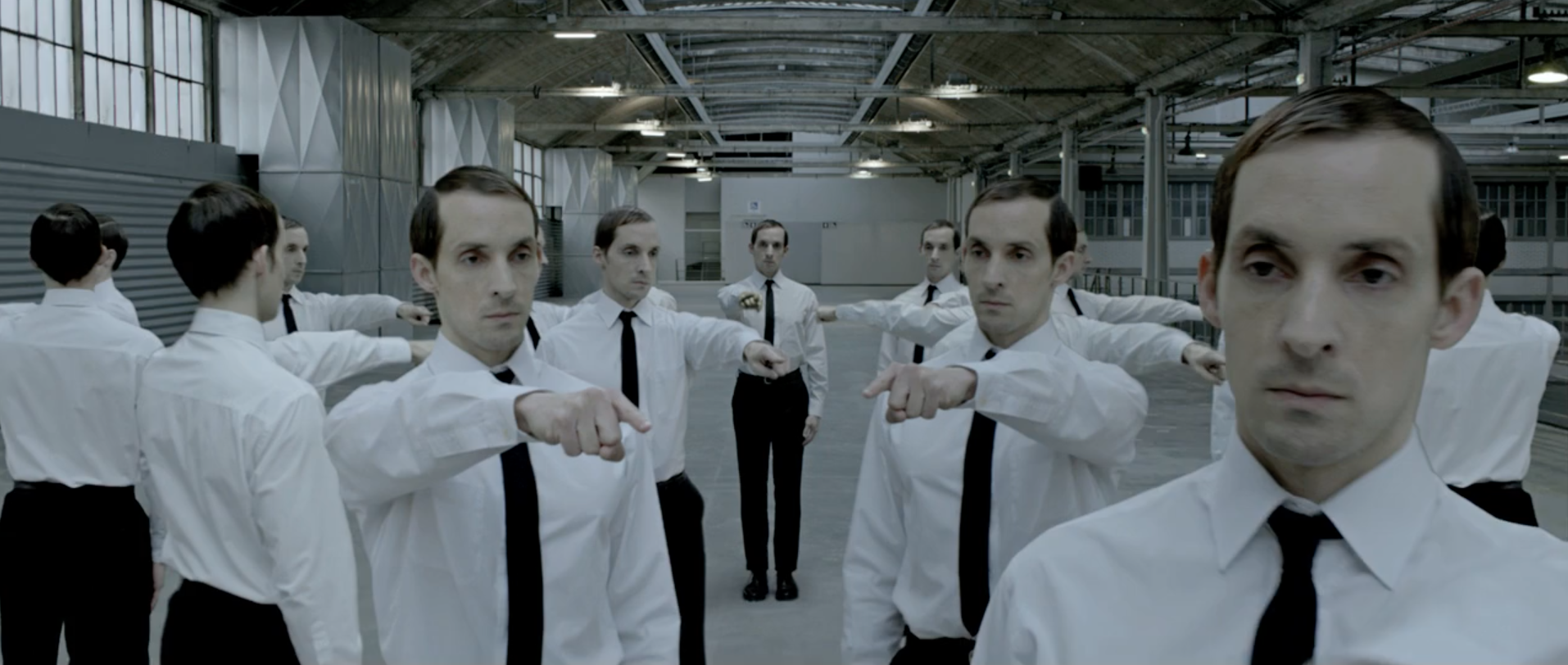 I assume that clones become an increasingly popular part of society because clones would explain why this group of people are standing motionless in formation in an empty warehouse looking like they're dressed for a wedding.