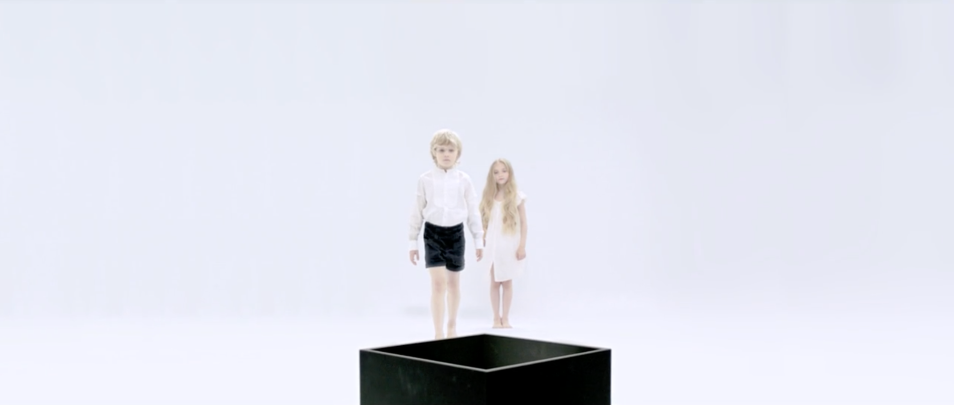 We begin with smiley, blonde-haired, blue-eyed childrens, that seem to be brother and sister or perhaps good friends. They are surrounded by all white space. Their world is essentially a blank canvas.