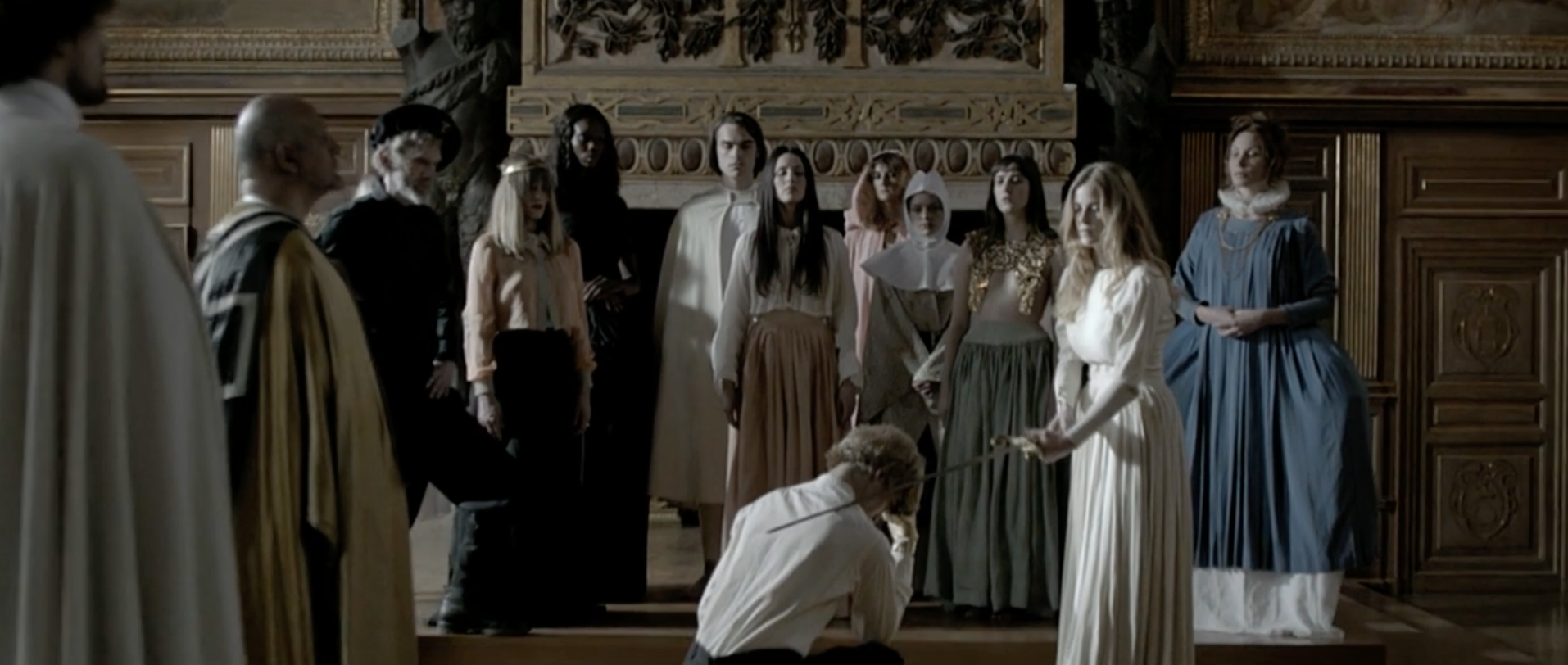 The Blonde-haired, Blue-eyed, now Metal-fisted, Muscular Teen/Man is being knighted by what one would assume to be his female child companion from the vid's beginning. They are surrounded by people dressed in pilgrim looking attire. An attire typically associated with a puritanical organized religion, typically associated with belief in a higher power creator of existence. The "puritans" in "Pursuit" kneel in honor of their higher-power; the Blonde-haired, Blue-eyed, Metal-fisted, Muscular Teen/Man.