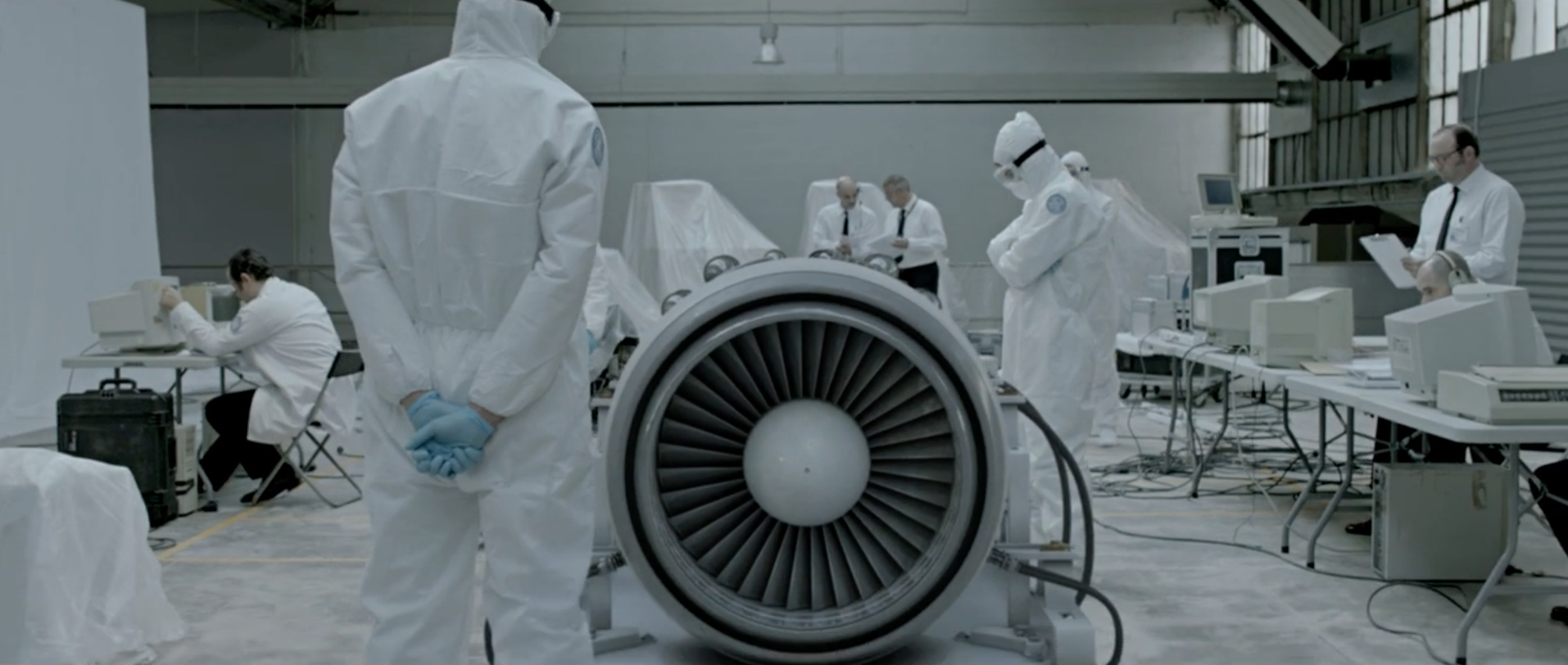 Clone creation could be the reason these lab coat, hazmat suit wearing men are laboring over this large device. Perhaps this device creates clones. Or, it also looks like it could be a big jet engine for a big bomb dropping jet. Either way, these guys are making weapons.