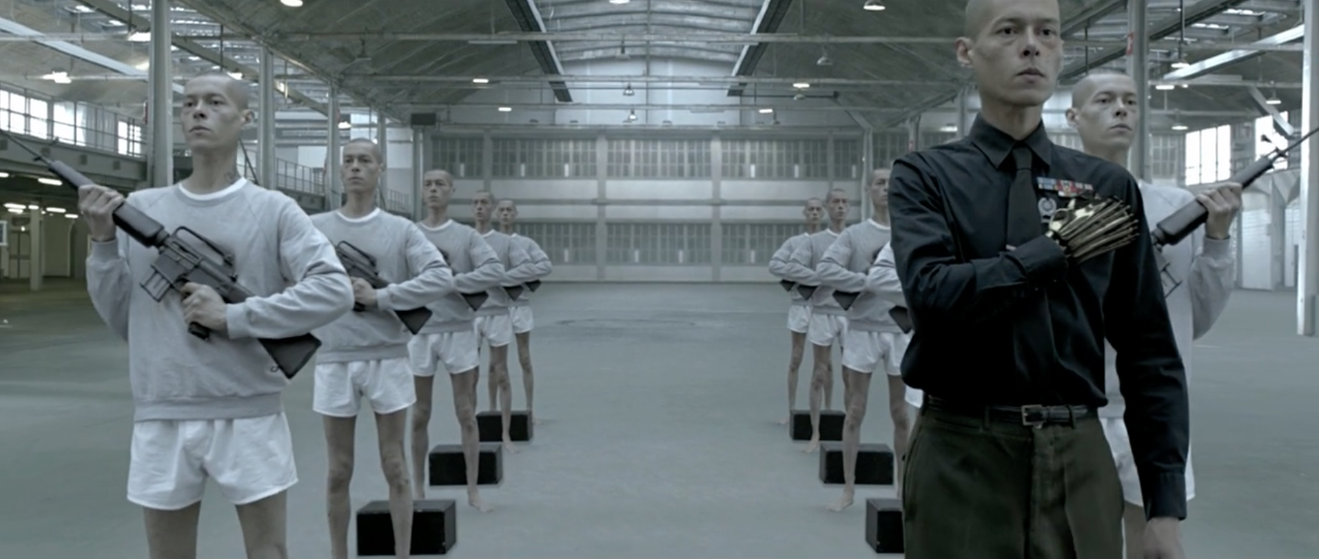 This backward dolly, long take, takes up 1 minute and 11 seconds, making this shot the video's center point. Before this shot we've witnessed the rapid evolution of a society where techno-weaponry merges with humanity. After this shot we witness its total takeover.