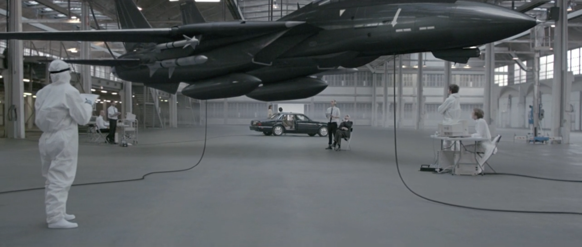 Meanwhile all the other people in the room are lab coat, hazmat suit, science guys and an old man, marveling at the machine gun/bomb jet that is somehow floating. They give no attention to the upset women in the background, nor even the new clone with the nice butt.